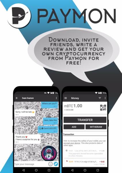 Первым 100 000 пользователям установившим и прошедшим регистрацию в Paymon и написавшим комментарий в Гугл Плей ,мы раздадим токены абсолютно бесплатно! В скором будущем у нас будет проходить ICO и мы щедро будем награждать участников поддерживающих наш продукт! В случае приглашения друга, ваш друг обязан указать ваш логин в сообщении нам.