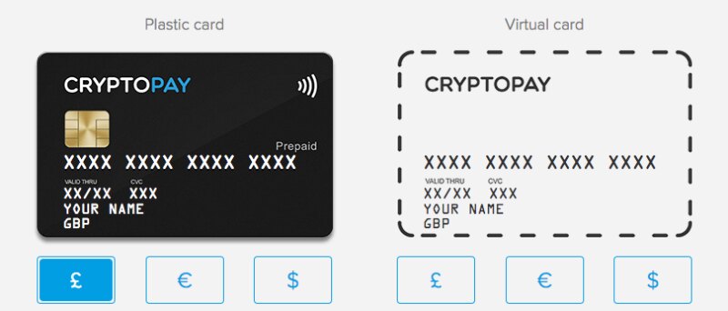 Существует два типа дебетовых карт Cryptopay: пластиковые и виртуальные: