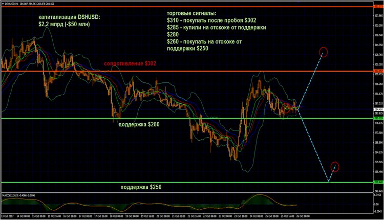 Потери по итогам дня составили $9,01 до $284,72, но и поддержка $280 оказалось не пробитой, несмотря на попытку медведей. На азиатских торгах пара DSHUSD торгуется в узком диапазоне, Alligator указывает на сохранение боковой динамики, как и MACD, гистограмма которого на нуле. На отскоке от $280 сработал наш сигнал на покупку с $285, по которому на данный момент незначительный убыток. Ждём прорыва вверх в сторону сопротивления $302 и выше.
