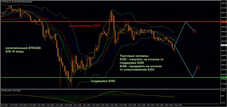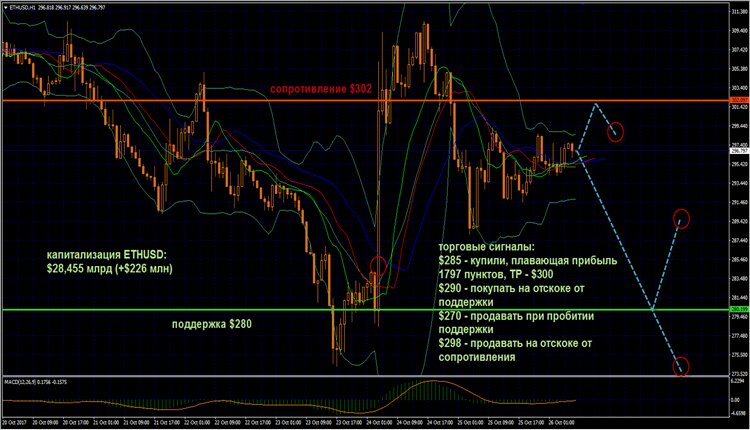 ETHUSD: Ethereum вторил динамике остальных альткоинов в четверг, подешевев на $1,99 до $293,72 в течение сессии. Открытая ранее сделка на покупку с $285 по-прежнему в прибыли – 1094 пункта ($109,4 на 1 лот). С американской сессии пара ETHUSD консолидируется в узком диапазоне $292,56-$299,43, при этом по Alligator – консолидация курса, как и по MACD, но Боллинджер указывает на возможное расширение волатильности. Сделку на покупку рекомендуем закрыть сегодня перед выходными, остальные сигналы остаются прежними.