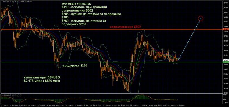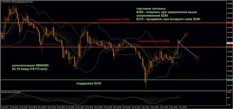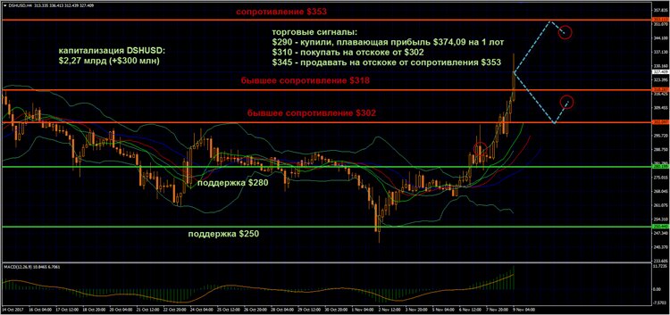 DSHUSD: На азиатских торгах сегодня Dash дорожает пятый день подряд. Вчерашняя сессия завершилась ростом DSHUSD на $21,64 до $306,80, пара наконец-то закрепилась выше сопротивления $302, впервые с 14 октября. Ранее открытая нами сделка на покупку с $290 приносит на данный момент 37409 пунктов прибыли или $374,09 на 1 лот. Рекомендуем перевести сделку в безубыток, следующая цель по паре – сопротивление $353.