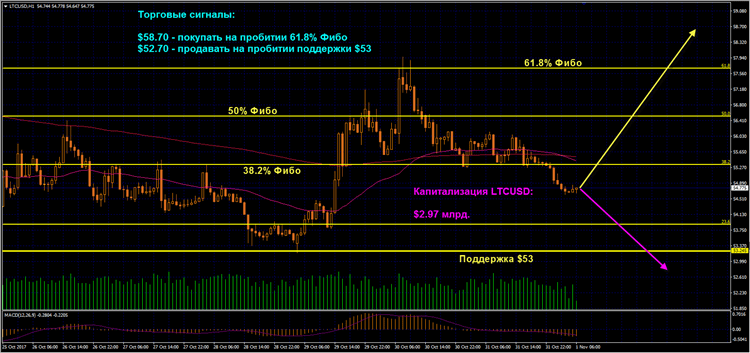 LTCUSD: Лайткоин приближается к нашей точке входа в шорты. Скользящие средние сигнализируют о дальнейшем снижении, на часовом графике ЕМА50 пробила сверху вниз ЕМА200. Если пара LTCUSD пробьет уровень поддержки $53, заходим в короткие позиции, начиная с отметки $52,70. Покупаем Лайткоин по цене от $58,70 после пробития вверх уровня 61,8% Фибоначчи.