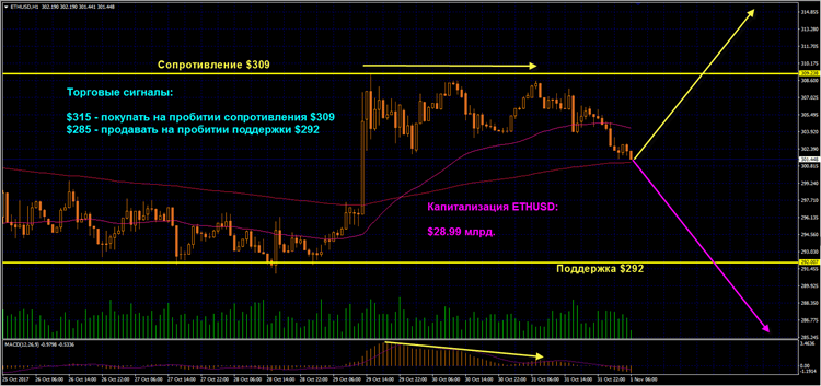 ETHUSD: Эфир, как и ожидалось, отскочил от сопротивления $302 под давлением медведей и роста объемов на продажу. В течение среды курс ETHUSD подешевел на $6,05 до $295,71 при торговом диапазоне $288,04-$302,1. Alligator указывает на сохранение флэта в узком диапазоне, по MACD на данный момент сигналов для открытия позиций нет. Прибыль по нашей сделке на покупку с $285 на данный момент составляет $179,7 на 1 лот (1797 пунктов), Take Profit выставим на уровне $300. На отскоке от сопротивления рассмотрим возможность продать, при этом тестирование поддержки будем рассматривать как сигнал на покупку, так и на продажу в зависимости от результата.