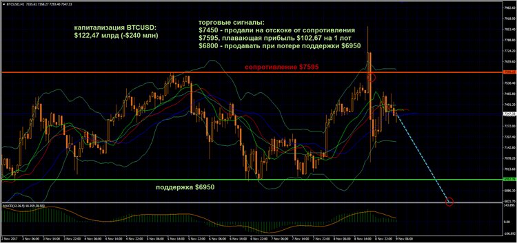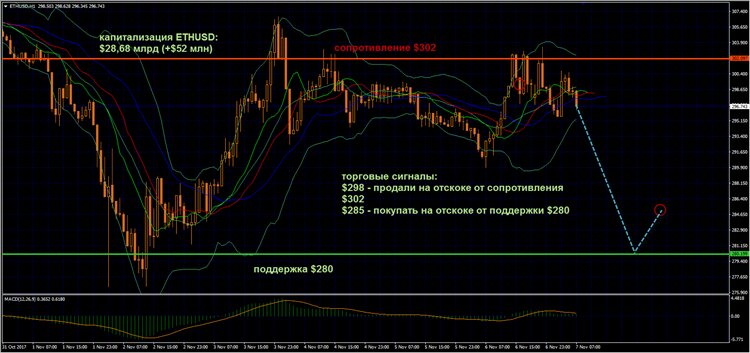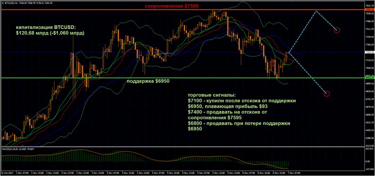 BTCUSD: Вчерашняя сессия оказалась сверхволатильной по Bitcoin из-за новостей об отмене харфорка segwit2x 16 ноября, торговый диапазон составил $830,72 ($7039,81-$7870,94). В одночасье Биткоин обновил исторический максимум до $7870,94, после чего скорректировался вниз на $800 в сторону поддержки $6950. Наш сигнал на продажу сработал с $7450, плавающая прибыль по которому составляет $102,67 на 1 лот. Скользящие Alligator указывают на формирование флэта, в то время как по MACD возможна коррекция вверх. Переведем сделку в безубыток и до нормализации ситуации по паре BTCUSD новых позиций открывать не планируем.