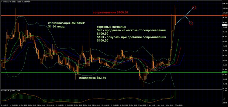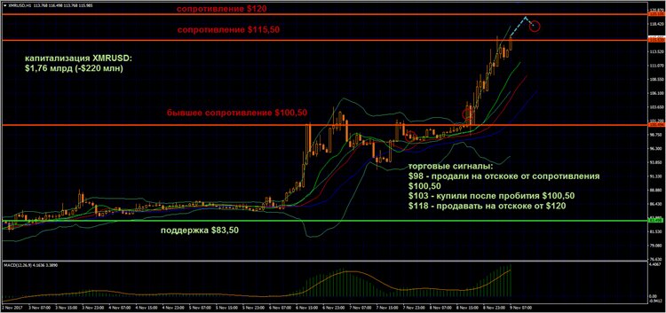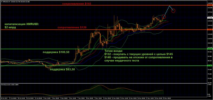 XMRUSD: Monero на равнее с Dash в последние дни демонстрирует исключительно восходящую динамику. На вчерашних торгах пара вернулась выше сопротивления $100,50, подорожав на $8,26 до $106,94. Со $103 сработал сигнал на покупку, при этом от $98 по-прежнему есть продажа XMRUSD. Пока пара тестирует сопротивление $115,5 ждем роста выше для фиксации прибыли в районе $115,50-$120 по лонгу, после чего ждем коррекцию вниз, чтоб минимизировать убыток по короткой позиции. Открыться на продажу можно в случае отскока от $120, так как по Боллинджеру и MACD пара все больше выглядит перекупленной.
