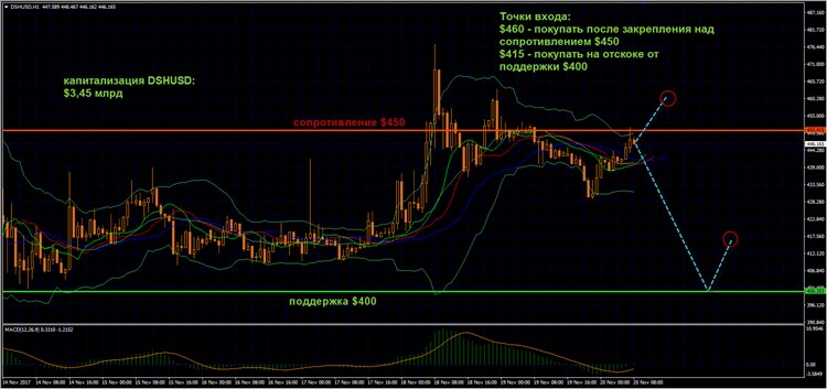 DSHUSD: Dash поднялся на новый уровень в пятницу, развив восходящую динамику на выходных, после медвежьей коррекции в начале недели. С пятницы DSHUSD дорожает на 8,39%, быки близки к ретесту $450 отметки. В случае успеха, покупатели могут замахнуть на недавний исторический максимум — $511, но и достижение $500 можно будет считать успехом. MACD указывает на сигнал на покупку, скользящие Alligator пересекаются, сигнализируя о возобновлении восходящей динамики. В случае роста выше $450 можно открыть лонг с целью $500.