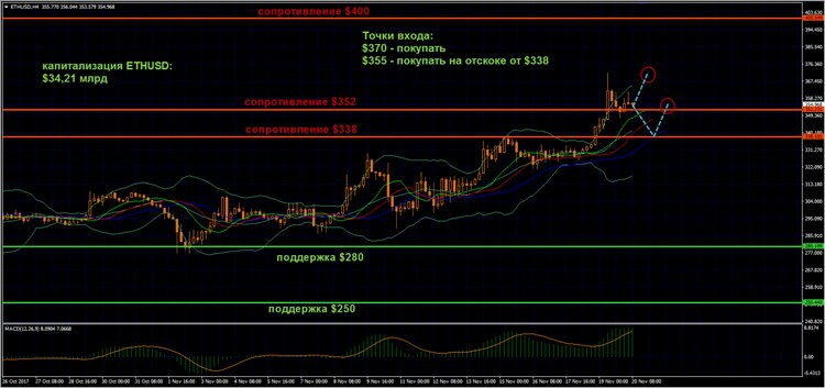 ETHUSD: Основной конкурент Биткоина — Ethereum удачно завершил предыдущую неделю, подорожав в пятницу лишь на 1,03% до $330,61, но на выходных сумели преодолеть сразу две ключевые области $338-$352. На азиатских торгах сегодня пара замедлила рост на фоне низких торговых объемов, тем не менее, динамика выше $352 позволяет рассчитывать на развитие коррекции в сторону $400-го сопротивления. По MACD пара выглядит несколько перекупленной, Alligator дает сигнал на покупку, двигаясь вверх. Пока пара ETHUSD выше $338 отметки, рассматриваем преимущество сделки в лонг на медвежьих коррекциях, в случае потери – продаем с $330-$325.