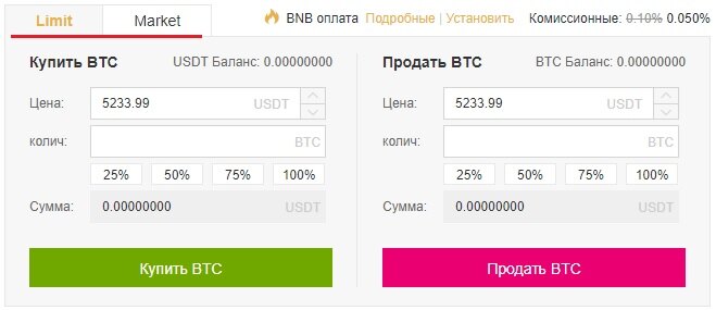 На бирже бинанс трейдерам доступно 2 вида ордеров: Limit и Market, в обзоре биржи Кракен мы писали, чем они отличаются. Там же можете прочитать, как ими пользоваться. При выставлении лимитного ордера, вам нужно вписать цену открытия, количество криптовалюты и нажать на кнопку купить или продать. При рыночной торговле доступным к заполнению будет только поле для указания количества криптовалюты.