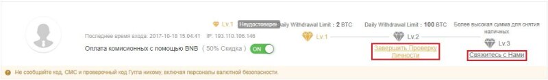 Верификация binance состоит из 3-х этапов. Первый этап верификации binance вы проходите, когда подтверждаете свой почтовый адрес – первая ступень верификации позволяет вам осуществлять вывод не больше 2 биткоинов в день. Для прохождения второго этапа верификации, вам необходимо нажать на надпись «Завершить проверку личности», находящуюся под среднем рубином.
