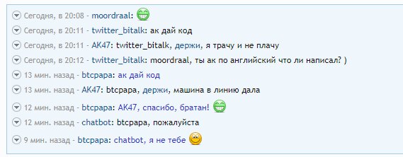 Появился новый бот АК47. Пока он раздает криптовалюту с рандомной переодичностью, т.е. может раз в час или три или восемь. За раз выкладывает от 3 до 5 кодов. Об ошибках бота пишите в этой теме. Предполагается, что он также будет выдавать коды по запросу в чат, а еще анализировать изменения курсов криптовают и прогнозировать какая криптовалюта пойдет в рост, другими словами, бот помощник трейдера. update 19.11.2017 Теперь бот может раздавать коды в чате. Обращаться к боту можно по следующим именам: ак47, ака, ак.