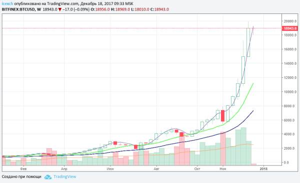 На прошлой неделе большинство криптовалют продолжили свой, поражающий воображение публики, рост. Bitcoin (BTCUSD) подорожал на 27.5% с $14900 до $19000, побывав при этом на $20000. Светлое тело недельной японской свечи вдвое превзошло "хвост" вверх предыдущей недели. Таким образом был устранён даже малейший технический намёк на перспективу значительной коррекции уже в 20 раз выросшего за год курса. Всё выглядит так, что вместо ожидаемой коррекции до $8000-$10000, будет просто замедление роста возле психологического уровня $20000. Технически настоящий момент подходит для долгосрочной покупки только тем, кто сможет перенести 50% и более падение курса. Тем же, кто намерен ограничить риск, мы рекомендуем дождаться более подходящего момента. Рекомендация: Держать. Покупать не дороже $10000. Ethereum (ETHUSD) за неделю взлетел на 65% с $430 до $710, достигнув максимума на $760 https://ru.tradingview.com/x/Y5uFE2jz/ Усиление роста и отрыв от предыдущей консолидации Держать. Покупать на $550-$600 (середина свечи предыдущей недели) BCHUSD за неделю потяжелел на 42% с $1288 до $1829, побывав на $2100 https://ru.tradingview.com/x/XaxUteJu/ Возобновление роста после коррекции Держать. Покупать от $1700 - вершина предыдущей волны Ripple (XRPUSD) за неделю утроился в цене: $0.23-$0.71, достигнув максимума на $0.918 https://ru.tradingview.com/x/mOS2Sg5x/ Прорыв из затяжной консолидации. Новая импульсная волна роста. Держать. Покупать на $0.45 - летний максимум и середина свечи прошлой недели Litecoin (LTCUSD) за неделю более чем удвоился: с $144 до $314, максимум $348 https://ru.tradingview.com/x/REsPwGQ2/ Держать. Покупать на $180-$200 - середина волны роста от $50 и медленная скользящая средняя на дневном графике DASH за неделю вырос на 60% с $675 до $1082, достигая $1200 https://ru.tradingview.com/x/aTCwrEDb/ Возобновление роста после коррекции. Держать. Покупать на $900 - предыдущая вершина NEM (XEMUSD) за неделю вырос на 76% с $0.38 до $0.67, достигая $0.77 https://ru.tradingview.com/x/if4aZ2dX/ Коррекция предыдущего взлёта отыграна. Получен сигнал на покупку от Пересечения скользящих средних на недельном графике. Держать. Покупать от обозначившегося на дневном графике уровня поддержки $0.45 Monero (XMRUSD) за неделю вырос на 44% от $240 до $345, достигая $360 https://ru.tradingview.com/x/MQycWiLR/ Очередной взлёт и абсолютный максимум. Держать Технически для долгосрочных покупок подходит уровень $150 - предыдущая вершина и медленная скользящая средняя BTGUSD за неделю вырос на 32% от $220 до $290, достигая $347 https://ru.tradingview.com/x/azCx9umE/ Затянувшаяся консолидация. Смешанная техническая картина. Рекомендация: стоять в стороне, ожидая надёжного выхода из консолидации ETCUSD за неделю вырос на 36% от $25 до $34, достигая $38 https://ru.tradingview.com/x/TrcJgaRA/ Возобновление роста после коррекции. Покупать. NEOUSD за неделю взлетел на 100% от $33 до $67, достигая $76 https://ru.tradingview.com/x/0xsB1g3E/ Начало новой волны роста после длительной консолидации. Достижение абсолютного максимума. Покупать Прибыльных сделок! Следите за нашими ежедневными и еженедельными обзорами #icex #bitcoin #криптовалюты #инвестиции #биржа #news #анализ #обзор