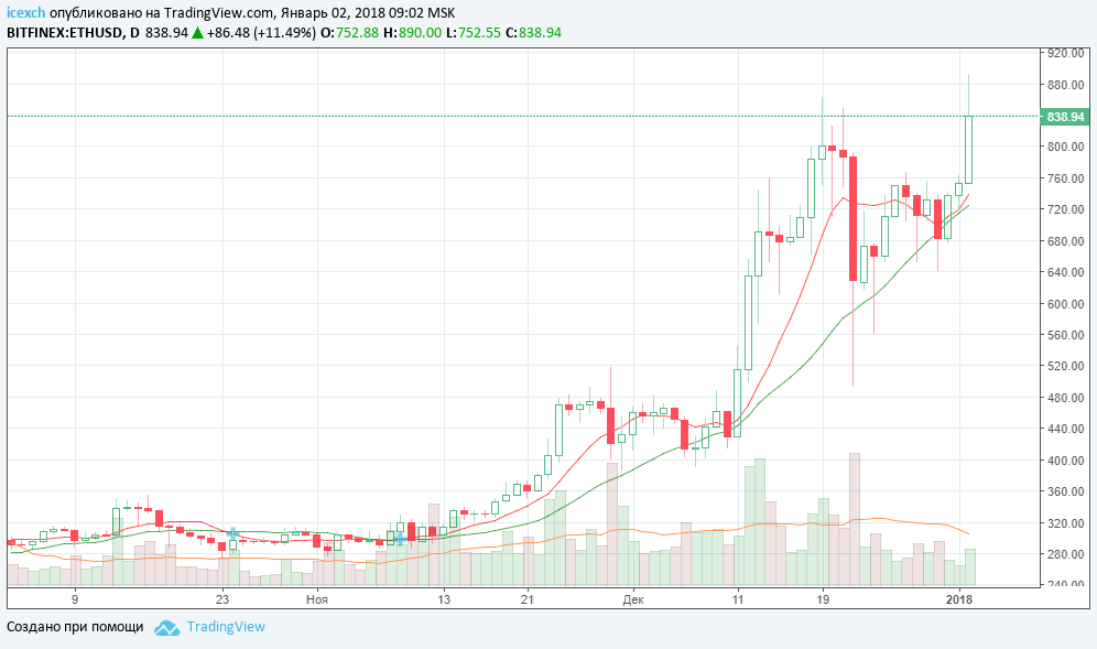 Ethereum и Ripple. Гонка за 2-е (а может затем и 1-е) место Итак номер 1 по капитализации среди криптовалют Bitcoin потихоньку сдувается (его доля уменьшилась с 54% до 36%) Это происходит не только благодаря снижению BTCUSD, но и набору веса других криптовалют, в том числе его ближайших конкурентов. Ethereum на днях утратил было, уже ставшее привычным, своё второе место по капитализации, уступив взлетевшему Ripple. Однако сегодня, увидев, что рост Ripple выдохся, Эфир перешёл в наступление и вернул себе второе место. Попутно нарисовав на графике привлекательную для покупки картину. В предыдущем обзоре по Ethereum мы писали о фигуре "даймонд" на графике. В техническом анализе она считается скорее разворотной. Однако сегодня мы видим, что ETHUSD, оттолкнувшись от медленной скользящей средней на дневном графике, совершил рывок вверх и достиг нового максимума на $890 Сейчас курс откатился на $840. Однако любое закрытие дня выше $800 будет рекордным и даст сигнал к среднесрочной покупке. Рекомендация: покупать #Ripple #Ethereum #Icex #Analysis #bitcoin #Анализ #icex