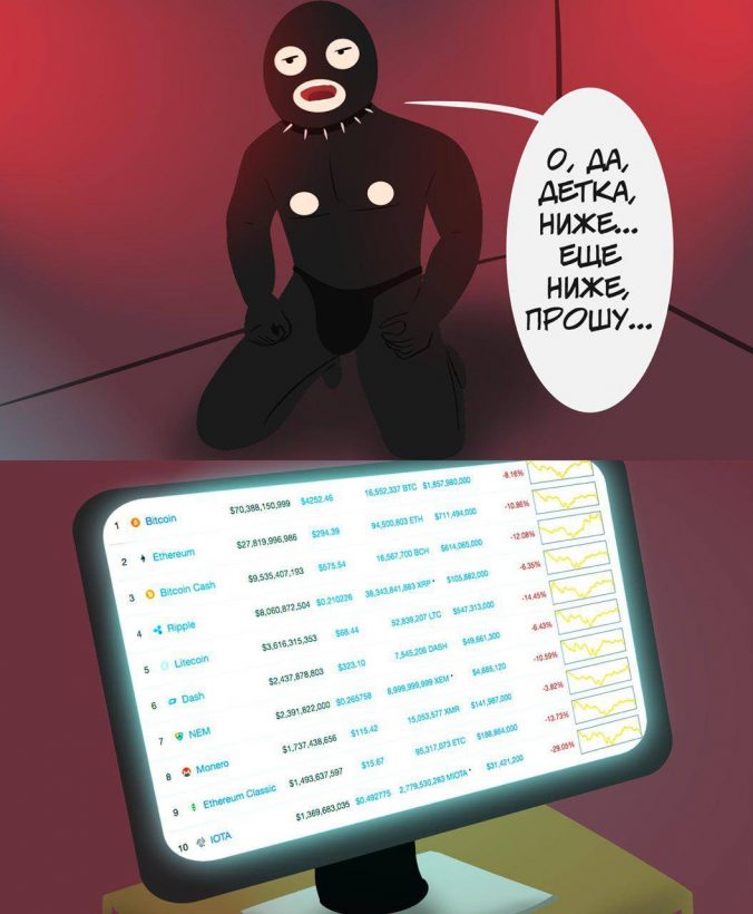 Реакция криптосообщества на глубокий дамп цены первой криптовалюты породила множество забавных мемов. Вспомнили трейдеры и о незавидном положении майнеров биткоина. Кстати, проходить собеседование предлагают в подходящей для этого одежде — свитере настоящего трейдера: И все же особую скорбь от сложившейся ситуации испытывали трейдеры, закупившиеся на “хаях” и вполне ожидаемо прокатившиеся после этого сами знаете на чем. Часть сообщества призвала расценивать происходящее как невиданную распродажу криптовалют: Другие отнеслись к ситуации по-философски: А некоторые и с долей мазохизма: