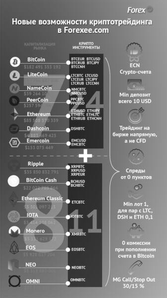 Forexee.com еще с 2014 оценил перспективность цифровых коинов и начал предоставлять своим клиентам возможность торговли криптовалютой. На счете ECN Crypto Вы можете торговать 24 парами с популярными криптовалютами: BitCoin, LiteCoin, NameCoin, PeerCoin, Ethereum и др. Начать торговлю можно с минимальным депозитом в 10 USD. Криптотрейдинг в компании доступен в режиме 24/7 напрямую на бирже через торговый терминал МТ4, а не через CFD. Также возможно пополнять счет прямо в Bitcoin с 0% комиссией при вводе и всего 0.001 BTC при выводе средств.