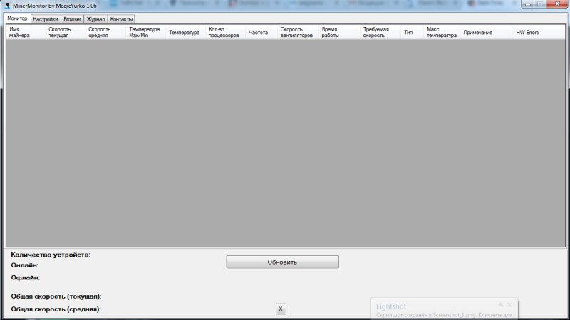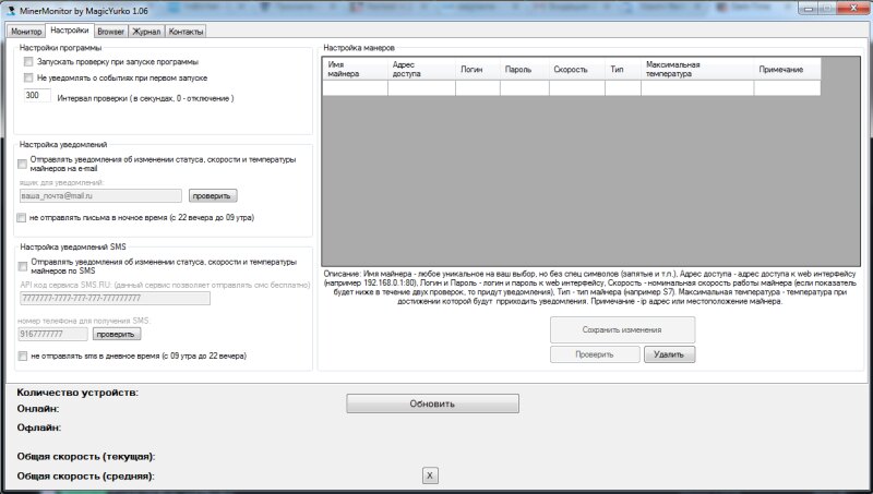 Вышла новая версия программы 1.08 Всем доброго дня! Не найдя подходящий софт для мониторинга майнеров(по разным причинам меня что то не устраивало) написал свой. Краткий принцип работы: программа опрашивает устройства и выводит всю важную информацию в закладке Монитор. Если асик не отвечает, либо упала скорость или повысилась температура выше требуемой в течение двух проверок, то тогда придут уведомления на почту и SMS. Так же работает проверка по кол-ву чипов и если идет отклонение, то программа выделит это желтым цветом. Буду рад любым предложениям по улучшению программы! Скрин1 Скрин2 Официальный сайт: http://minermonitor.online/