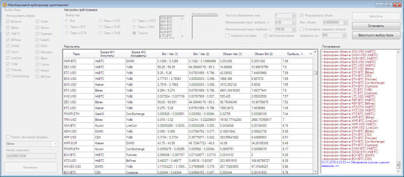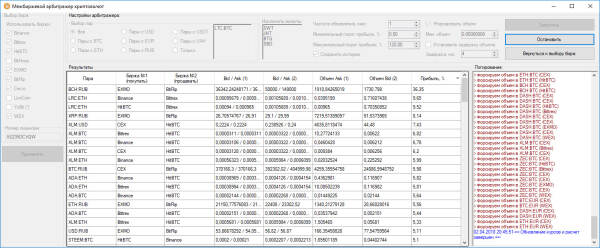 02/04/2018 Новый релиз Что добавлено: Добавлены объемы — теперь в программе доступны объемы по заявкам в асках и бидах Добавлен фильтр «Максимальный порог прибыли» — это хороший инструмент, чтобы отсеивать клоны (разные валюты, но с одинаковыми тикерами) Добавлен фильтр «Мин. объем» — устанавливаете минимальный объем, и если в заявке аск или бид, будет меньше объем, такая арбитражная возможность не попадет в результаты