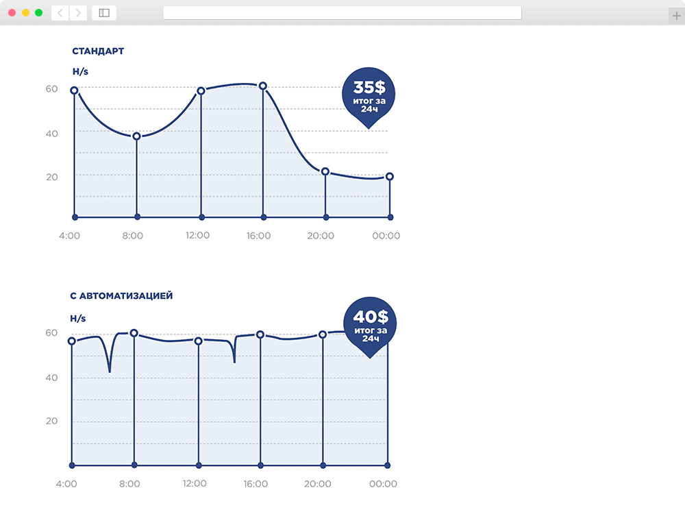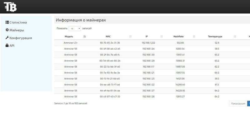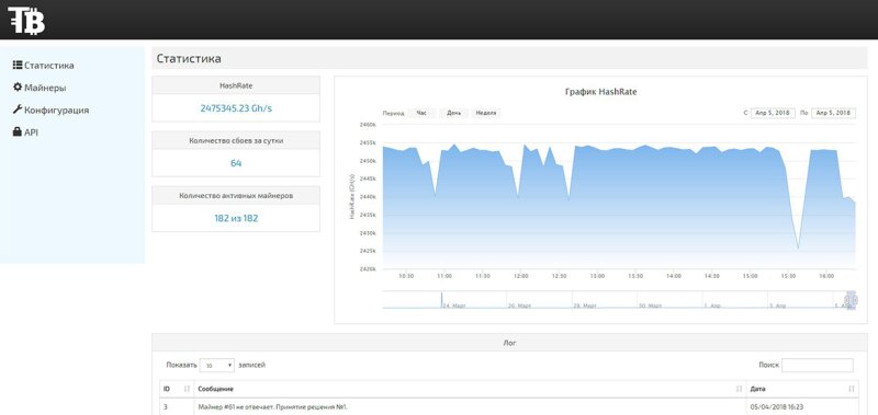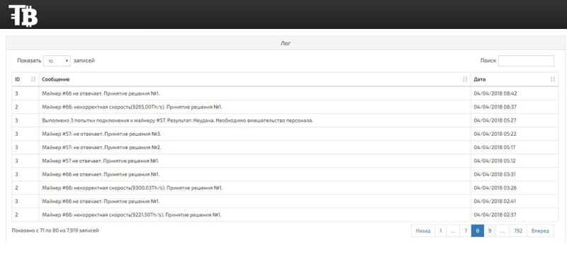 Сервис управления ASIC майнерами HashKeeper от Tehnobit Systems одобрено РАКИБ Автоматическое решение ошибок Падение хэшрейта из-за ошибок напрямую влияет на доход. Робот самостоятельно контролирует работу всех устройств, без участия человека, автоматически восстанавливая работу оборудования в среднем за 3 минуты. 1. Мониторинг Система собирает данные с оборудования по 16 параметрам 2. Анализ Система анализирует данные по заданным алгоритмам, понимая какая проблема у конкретного устройства. Скорость обработки 5000 асиков за 5.6 сек 3. Принятие решения На основании данных, система принимает одно из 7 решений. Позволяя восстановить работу оборудования без участия человека Дистанционное управление Свободный доступ в любое время, в любом месте. Управляйте оборудованием с телефона или компьютера. Забудьте про teamviewer! Автоматическая настройка Для установки и настройки нового оборудования, достаточно просто подключить его к сети. Система сделает настройки по выбранному вами шаблону для новых устройств. Статистика ·Общее количество добавленных и активных майнеров (показывает асики всех алгоритмов вместе) ·В блоке HashRateможно посмотреть Общий HashRate всех устройств и отдельно HashRateпо всем алгоритмам разных моделей устройств ·Интерактивные графики HashRateотдельно для каждого алгоритма, частота обновления 5 минут ·Общее количество сбоев за сутки ·Поле логов работы системы, с возникающими ошибками и их решением, В зависимости от возникшей проблемы система принимает решения для восстановления работы оборудования или высылает уведомления на emailпри необходимости вмешательства человека в обслуживание оборудования Как работает система принятия решений? Сбой работы майнера: Низкий хэшрейт / или слишком высокий: Решение 1, определяется какая плата дает низкую скорость, делаем re-set hashboard если не помогло восстановить скорость, то Решение 2., переподключение к пулу если не помогло, то перезагрузка асика Сбой работы платы: Если, например, одна плата отказала Решение 1, перезагрузка асика Решение 2, если плата определилась, но не хэширует, то re-set hashboard Решение 3, если не помогает 1 и 2, то останавливаем работу кипера по отслеживанию этой платы и пишем письмо, что требуется вмешательство персонала. Перегрев: Решений нет, уведомляем о том, что плата или чипы на асике перегрелись Кулеры: Решение 1, остановка и попытка запустить ошибочный кулер, если после перезапуска так же не хватает скорости вращения, значит от сдох и пишем письмо. Сбой работы майнера: Невозможно подключиться к майнеру (получить данные) Решение 1, если можно подключиться через SSH или API, то делаем re-link на адаптере Решение 2. если доступен web-интерфес, то пробуем настроить сеть заново, если есть настройки, то с сохранением предыдущих настроек Решение 3. Если ничего не помогло, то больше не подключаемся и пишем письмо Майнеры ·Основная информация по каждому устройству ·Возможность сортировки и поиска по каждому параметру ·Добавление заметок по каждому устройству, что позволяет группировать и искать асики по заданным Вами параметрам (Имя клиента, номер на полке и тд) Конфигурация ·Массовая или выборочная настройка пулов для устройств Достаточно выбрать нужные майнеры, задать параметры Пулов и нажать кнопку «Применить» Если Пулы уже были настроены на устройствах, до установки HashKeeper, вводить данные заново не