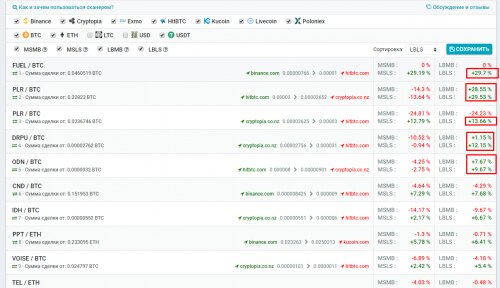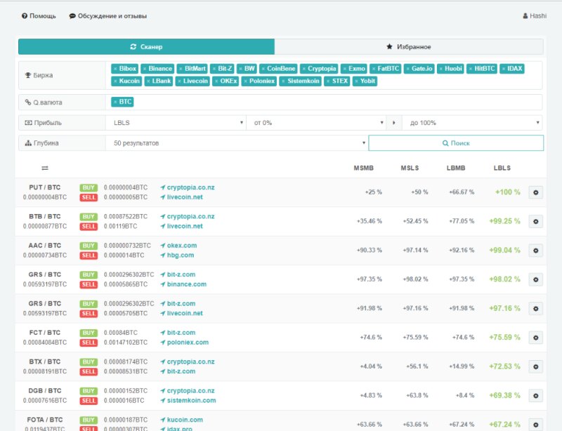 Здравствуйте уважаемые участники форума. Представляю вашему вниманию сканер для арбитража криптовалют. Сканер работает следующим образом. Проверяет 4 варианта совершение сделки 1. MSMB - Market SELL -> Market BUY покупаем по рыночной цене на первой бирже и продаем по рыночной цене на второй бирже. 2. LBMB - Limit BUY -> Market BUY Покупаем выставив ордер в стакане BUY на первой бирже и продаем по рыночной цене на второй бирже. 3. MSLS - Market SELL -> Limit SELL покупаем по рыночной цене на первой бирже и продаем выставив ордер SELL на второй бирже. 4. LBLS - Limit BUY -> Limit SELL Покупаем выставив ордер в стакане BUY на первой бирже и продаем выставив ордер SELL на второй бирже. Подробно какие пункты за что отвечают можете посмотреть вот тут https://cryptoshock.org/threads/kak-i-zachem-polzovatsja-skanerom.142/ Цена месяца 0.002 BTC Ссылка на сканер https://cryptoshock.org/pages/monitor-arbitrazh-kriptovaljut/ Если есть желающие могу троим дать доступ для что бы проверить и протестировать. Для этого нужно будет зарегистрироваться и скинуть ваш ник.