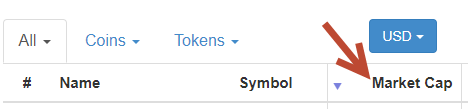 Дальше сортируем по убыванию рыночной капитализации (клик по столбцу MarketCap) – вверху списка окажутся дорогие криптовалюты, а нам нужны как раз самые дешёвые.