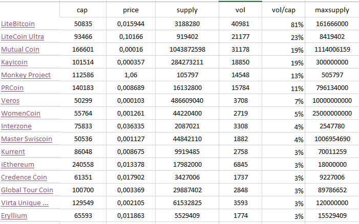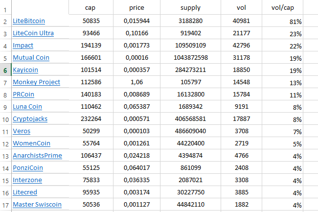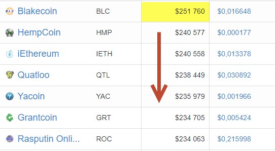 На картинке нашли 251 тысячу и пошли от неё вниз до монет, у которых капитализация едва превышает $50000. Ниже я не иду, обычно достаточно такой выборки.