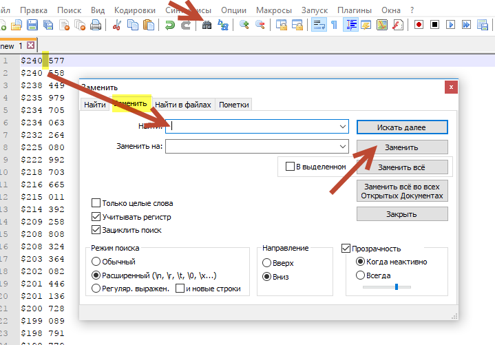 • Скопируйте числа с пробелами из Excel в Notepad++.
