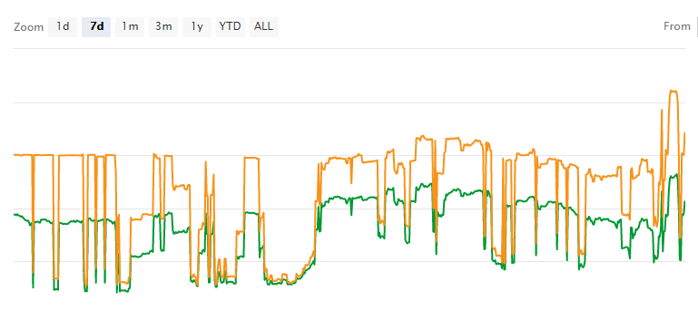 Хороший признак – кривая цены в биткоинах идёт над кривой цены в долларах. Это, увы, редкость, но обращать внимание стоит.
