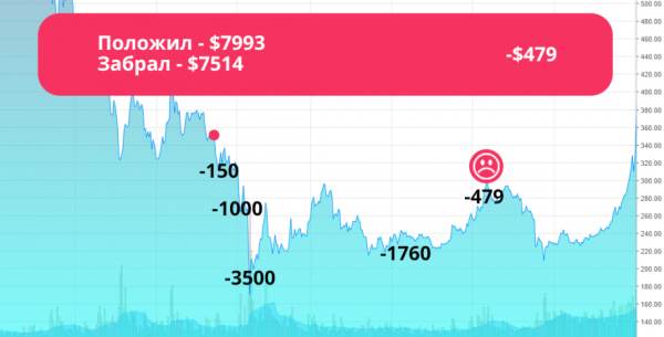 Итог: $7993 — положил, $7514 — забрал. В минусе на 479. А если сюда прибавить прошлую прибыль, то получим (-$339)