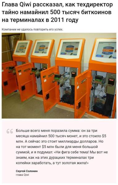 Я пригласил техдира к себе и сказал: «Ты использовал ресурсы компании, так что, во-первых, верни, а во-вторых, расскажи, что за хрень ты все-таки делаешь, что ты майнишь». А он достал заявление об увольнении и ответил: «Ну, во-первых, нет, не верну, а во-вторых, я увольняюсь». Я его отпустил, да и нельзя было ничего сделать: ну помайнил чего-то, прямого убытка нет, урона не нанес — только арендодателям, которые где-то там платят за электричество. >> подробней << сама компания повторить его успех не сумела, т.к. на терминалах не получилось запустить распределенный майнинг) но скорее всего, это пиздеж, и перед увольнением он им наверняка разъяснил, что да как)
