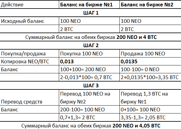 Предположим, что у нас есть 200 монет NEO и четыре биткоина, которые мы храним на двух криптобиржах в пропорции 50/50 для диверсификации рисков (см. в таблице — ШАГ 1). При появлении межбиржевого спреда, мы покупаем NEO (за счет имеющихся в кошельке BTC) на первой бирже и полностью продаем их на второй (см. ШАГ 2), после чего совершаем два перевода с биржи на биржу, чтобы восстановить баланс (ШАГ 3).
