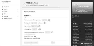 Trodax.com - это система автоматической торговли, управляющая вашим счетом на бирже. Базовая торговая стратегия проста и отлично показывает себя на рынках с большими колебаниями курса. Купив криптовалюту, торговый алгоритм (Cryptocurrency Automated Trader или CAT) автоматически рассчитывает уровень продажи для получения прибыли (Take Profit или TP), с учетом комиссии биржи, и особенностей конкретной криптовалюты. Как только стоимость криптовалюты достигает расчетного уровня - алгоритм продает ее и начинает новую сделку. Если же рынок не достигает нужной цены и купленная валюта дешевеет - алгоритм дополнительно закупает криптовалюту, осуществляя так называемое «усреднение». После усреднения, уровень TP автоматически пересчитывается исходя из средней стоимости объема купленной криптовалюты. Автоматический режим торговли предельно упрощает жизнь трейдеру. Вам достаточно только выбрать стратегию и запустить C.A.T's. Гибридный интеллект сам выберет пару для торговли. Вовремя войдет в сделку и во время выйдет из нее, если ситуация на рынке будет меняться! За всеми действиями нашей системы, Вы можете наблюдать онлайн! Мы разработали 4 стратегии: Careful , Reasonable, Active and Optimistic. Они рекомендуются к использованию при разных условиях рынка. Все стратегии различаются количеством страховочных ордеров, размером первоначального ордера и уровнем Take Profit. CAREFUL Если у вас большой размер депозита и вы не хотите рисковать, и возможно даже холдить свою крипту с небольшим процентом дохода. Бот будет торговать в плюс при уже установленных условиях, где стартовый ордер равен 5% от общего депозита, а количество страховочных ордеров максимально возможное. Рекомендуется к использованию на медвежьем рынке. REASONABLE Выбирайте эту стратегию, когда рынок идет на повышение. Здесь первоначальный ордер равен 7% от общего депозита, максимальное количество усредняющих ордеров – 14, при 3 страховочных, выполняемых в одно время. ACTIVE Данная стратегия предоставляет вам возможность создавать доход даже при малом депозите, потому что стартовый ордер равен 10% вашего депозита и 2 страховочных ордера устанавливаются одновременно. Стратегия рекомендуется на растущем рынке. OPTIMISTIC Стратегия для самых амбициозных и готовых идти на риск, рекомендуется к использованию во время дикого роста рынка. Позволяет вам легко приумножить ваши доходы, даже при малом размере депозита на бычьем рынке. будьте осторожны, так как есть высокий риск просадки депозита. Гибридный интеллект Его задача: выбрать пару для следующей сделки автоматического торгового алгоритма. В основе рекомендации гибридного интеллекта 2 компонента: Расчеты полученные инструментами технического анализа Автоматический оценка достоверности наиболее популярных сигналов, таких как сигналы сообщества tradingview.com, агрегатора новостей cryptopanic.com и рекомендации TOP трейдеров. Работа над гибридным интеллектом Trodax ведется постоянно. Главная цель разработчиков - снизить риски автоматической торговли, обеспечивая среднемесячную доходность в 5-10% от депозита.