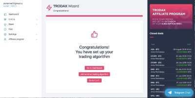 ТРОДАКС – АВТОМАТИЧЕСКАЯ ТОРГОВЛЯ КРИПТОВАЛЮТОЙ Добрый день! Приглашаем Вас в мир прибыльной автоматической криптоторговли - Trodax! Что такое Trodax.cat? Trodax создан профессиональными трейдерами для людей, которые хотят быть вовлеченными в мир криптовалюты и торговать только в плюс ☺! Идея о создании такого сервиса пришла нам, когда мы наблюдали за ситуацией на рынке: трейдеры-новички покупали криптовалюты и не знали, как торговать таким образом, чтобы получать доход, а не уходить в большие минуса, но, при этом, они не хотели глубоко погружаться в подробности устройства процессов криптовалютного трейдинга. Поэтому, мы создали сервис, который дает Вам возможность гарантированно торговать в плюс без вашего постоянного участия! Кликните на ссылку, чтобы получить пробную 14-дневную версию Trodax! https://trodax.com Trodax – это автоматический сервис для торговли криптовалютами, основанный на гибридном интеллекте. Просто подключите Trodax к вашей криптовалютной бирже, выберите криптовалютную пару и настройки, которые соответствуют вашим целям! Trodax будет формировать идеальные условия для создания и увеличения вашей прибыли! Как это возможно, - получать стабильный рост Вашего депозита автоматически? Базовый алгоритм работы сервиса очень прост. Получив сигнал для входа, Trodax приобретает монету и тут же выставляет ордер на её продажу и 3 страховочных ордера . Если цена растёт и заявка срабатывает, сделка завершается в плюс. Если нет — срабатывают страховочные ордера. Таким образом, в запасе постоянно имеется несколько страховочных ордеров, каждый из которых размещается на определённый процент ниже цены открытия сделки. Take Profit также сдвигается вслед за падением цены. Так отрабатывается стратегия усреднения. Тем самым для достижения желаемого Take Profit , не нужно ждать изначальной цены продажи. Вы получаете доступ на парень управления на нашем сайте, а также в мобильном приложении, и можете следить за всеми процессами торговли на вашем аккаунте, которые совершаются автоматически. Вам доступны все отчеты, аналитика, а также Вы можете получить рекомендации по выбору криптовалюты. Все сделано людьми для людей! Мы учли все пожелания, а также недоработки всех торговых ботов! Кликните на ссылку, чтобы узнать больше подробностей о Trodax: https://trodax.com/about/ У нас есть два режима работы алгоритма: ручной и автоматический. Ручной режим Просто подключите API ключи от биржи, выберите криптовалютную пару и установите настройки бота. Далее, Вы можете сами выбирать момент входа на рынок или предоставить этот выбор Trodax, используя необходимые фильтры. В среднем, трейдеры зарабатывают от 3% во время падения рынка, до 60% во время активного роста. Автоматический режим Просто подключите API ключи от биржи, выберите желаемые настройки соотношения прибыли-риска и Trodax будет торговать в плюс без Вашего участия! Торговый бот выбирает криптовалютную пару и момент входа на рынок, в соответствии с торговой стратегией, разработанной на основе гибридного интеллекта. Больше подробностей о нашем автоматическом и ручном режимах работы: https://trodax.com/faq/ Секрет успеха Тродакс: • Профессиональный опыт в торговле криптовалютами Мы собираем прогнозы, сделанные лучшими трейдерами и используем их в нашем сервисе. • Гибридный интеллект Собрав лучшие и достойные доверия прогнозы трейдеров, искусственный 