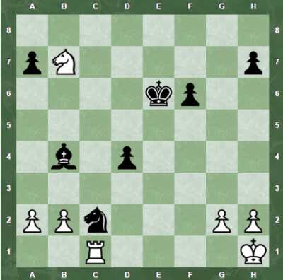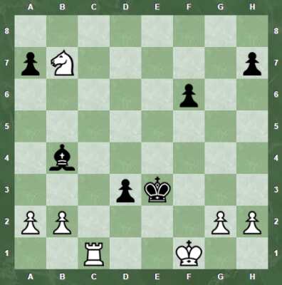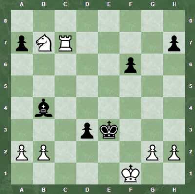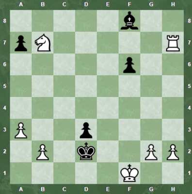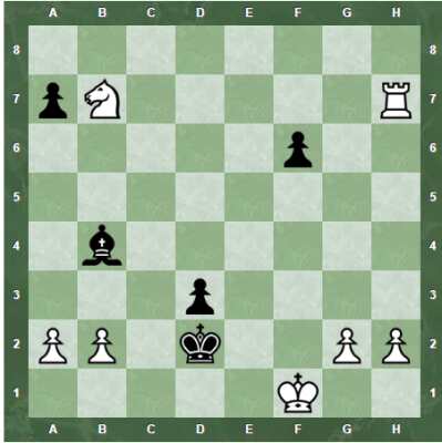 Ну а мы забрали слона ферзем. Без слона то не выгорает там мат у белых вроде, даже если пешку провести. Хорошо, вот 5b2/pN5R/5p2/8/8/P2p4/1P1k2PP/5K2 w KQkq - 0 1 Тут можно долго так катать Ну стал сзади, а король е3. Если отойдет конь перекроемся слоном. С двумя пешками больше шансов конечно. Но пешка слева у черный есть, а король скушает пешки слева. Там неясно.