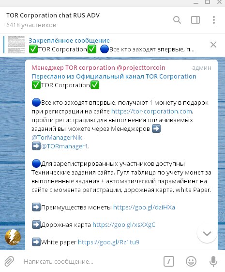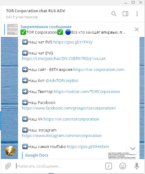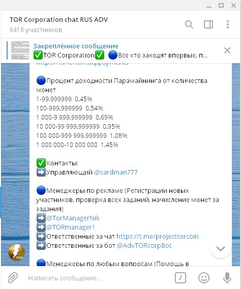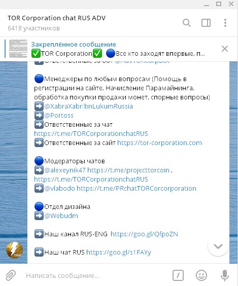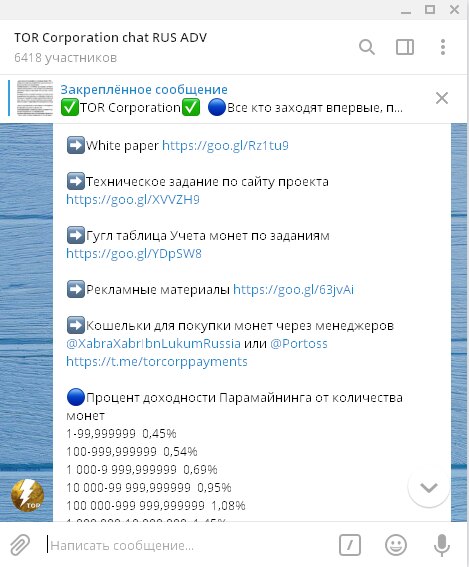 Кстати, у них ещё есть свой рекламный чат https://t.me/PRchatTORCorcorporation где можно бесплатно разместить свою любую реферальную ссылку на проекты, касающиеся криптовалют.
