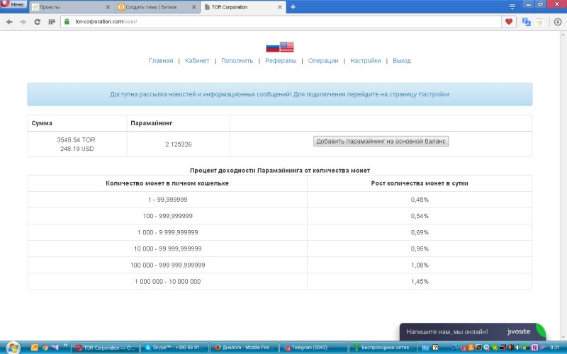 Цена одной монеты составляет сейчас всего 1 цент, поэтому цифра в долларах немного завышена, так как зависит от рекомендуемой цены. Но сейчас хорошее время для закупки. Я закупила монет всего на 30 долларов (остальные заработала) и теперь ежедневно в кабинете капает 25 центов. Но цифра растёт, так как после нажатия на кнопку Добавить парамайнинг на основной баланс главная цифра растёт, а следовательно увеличивается количество напарамайненого. Да, есть условие: нужно купить и перевести в кабинет хотя бы 1 монету, но даже если вы потратите 10 центов на 10 монет, вы сможете получить доступ ко всем заданиям, оповещения о которых будет появляться в официальной группе https://t.me/projecttorcoin, канале https://t.me/torcorporation и здесь https://t.me/TORCorporationtasks . Так же есть чат для общения с другими участниками https://t.me/TORCorporationchatRUS и https://t.me/projecttorcoin Советую вступить во все. Хорошая новость: проект развивается и планы большие. Я приняла для себя решение участвовать, так как вижу потенциал. Если есть вопросы, что-то не понятно, спрашивайте.