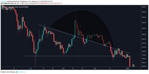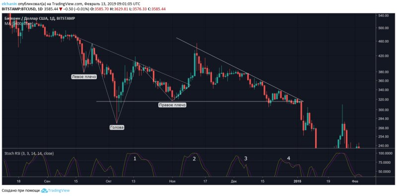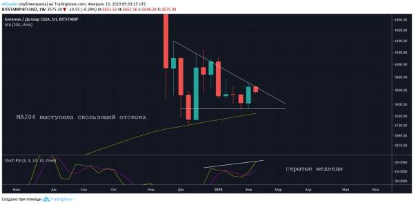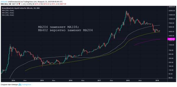 Источник: https://ru.tradingview.com/u/elchanin/ После импульса 8 февраля рынок утих в флете, что говорит о низком интересе покупателей. Исходя из этого, можно представить данный росток как открытие биг-шорта, ибо всплеск объема на CME просто космический! После таких предположений мозг сменил бычью прошивку на красного медведя. Что будет с Битком, если главный манипулятор медведь? Эта мысль заставила меня найти доводы за снижение. Сейчас я расскажу и покажу их, поехали! 20 часов назад Комментарий: 1. Фрактал треугольника Падения с $6100 Один треугольник уже был, ничего не мешает отыграть второму! Похоже на рост 8 февраля, правда? 20 часов назад Комментарий: 2. Сравнительный анализ фрактала 2014 года Сегодняшняя ситуация Битка уж больно похожа на 2014 год, по закономерности которого большинством ожидается откат до 50-62% коррекции падения с $6100. Однако, анализируя историю можно упустить тот факт, что в 14г паттерн пГИП отработал четко по статистическим целям коррекции! Наш же пГИП оказался бычьей ловушкой. Включаем абстрактное мышление, и стираем результат отработки пГИП 14, получаем аналогичный треугольник нашему. Похож же 20 часов назад Комментарий: 3. Медвежья дивергенция Стохастика на недельном ТФ + выявленная зависимость скользящих поддержек На недельном ТФ все выглядит гармоничнее, и если в 14 году MA108 отодвинула падение к дну, то сейчас в этом же месте MA204 выполнила данную функцию. Зависимость следующая: увеличение в два раза первого числа, уменьшение третьего тоже в два раза. 19 часов назад Комментарий: Почему маркетмейкер медведь? Гипотеза гласит о том, что Бычий забег 17 года был организован непосредственно под открытие официальных фьючерсных торгов. После чего произошел перелом тренда. Теперь медведи-организаторы настроены на снижение до минимального значения. Все просто – владельцы печатного станка хотят урвать максимум. Но, снижать нужно до адекватных значений, ведь ММ на рынке не один. Исходя из этого, самую адскую цель можно найти на уровне хая забега 14 года (около $1150). Не стоит забывать, что интерес к Биткоину есть и у долгосрочных инвесторов, которые наблюдают из далека. Поэтому, прогнозирую разворот тренда у скользящей MA402 – средняя цена за всю историю торгов Битштампа (ведущая биржа на мой взгляд).