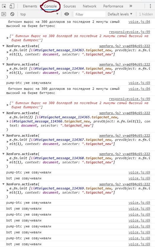 Сделал голосовые сообщения об изменениях курса биткоина. Автоматически сообщает при резких скачках курса. Оповещение работает только для залогиненных пользователей. Возможно потребуется обновить кеш одновременным нажатием CTRL+F5. После обновления страницы просто кликните в любое место страницы в любую пустую область, чтобы активировать вкладку или нажмите любую кнопку на клавиатуре. Позже это будет реализовано кнопкой справа. Достаточно активировать один раз - дальше можно переключать вкладки, идти спать - голосовые сообщения будут работать, если будет работать ваш комп. Добавил также функцию голосовых сообщений для бота, чтобы проще было тестировать. Но вижу не у всех работает. У кого не работает следайте следующее. Нажмите правой кнопкой мыши в любое место страницы. Выберите "посмотреть код" или "исследовать элемент" (в разных браузерах по разному называется). В Яндекс Браузере консоль открывается справа. Подождите минуту примерно, а потом сделайте скриншот содержимого. Заодно пишите какая у вас винда. На мобильных еще не проверял.