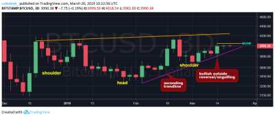 • Биткойн может подняться до недавних максимумов около 4200 долларов в краткосрочной перспективе, если цены подтвердят бычью внешнюю разворотную или «поглощающую» свечу, созданную за три дня до 16 марта, с убедительным прорывом выше 4040 долларов (максимум поглощающей свечи).