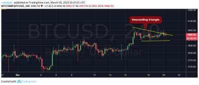 На 4-часовом графике BTC изо всех сил пытается форсировать прорыв нисходящего треугольника, что, в случае подтверждения, улучшит перспективы цен, находящих принятие выше критического сопротивления на уровне 4040 долларов.