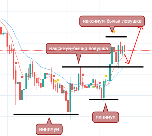 На данный момент цена откатывается в усредненную и возможно сформирует ловушку, но уже медвежью: цена начинает нисходящее движение вовлекая все новых и новых продавцов, тем самым забирают их позиции покупатели.