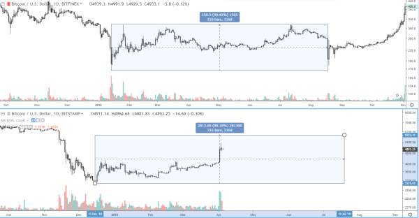 Трейдер и криптоаналитик Джош Рейджер предположил, что фаза накопления биткоина продлится до середины июля, затем последует уверенный рост цены. По его словам, текущая динамика цены схожа с той, что наблюдалась в 2015 году. После достижения биткоином «дна» фаза накопления продлилась 216 дней: Сравнение динамики движения цены биткоина в 2015 и в 2019 году. При этом сформированная 2 апреля бычья свеча величиной в $1000 соответствует середине текущей фазы накопления. Последняя, уверен Рейджер, завершится 19 июля 2019 года. Однако трейдер подчеркнул, что это лишь гипотеза. Позже он опубликовал твит с графиком, где указано, что границами зоны консолидации могут служить простые скользящие средние (МА) с периодами 100 и 200 недель, выступающие в роли сопротивления и поддержки соответственно. Таким образом, для начала бычьего ралли цене необходимо пробить сопротивление в виде 100-недельной MA. Неделю назад Джош Рейджер поделился мнением, что грядущая фаза бычьего цикла биткоина завершится в 2023 году на отметке $150000.