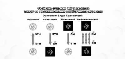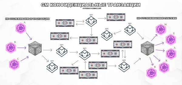 GM транзакции в сети Smartholdem выполняются посредством уникальных одноразовых «Smart-адресов». Адреса скрывают связь между адресом отправителя, адресом получателя и любыми другими транзакциями/адресами.