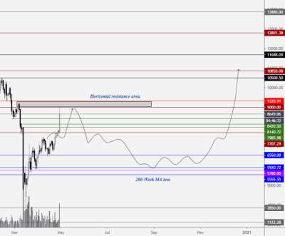 Как видно на графике, его сценарий предполагает снижение в район $5900. После этого, считает ван де Поппе, начнется новый виток бычьего рынка.