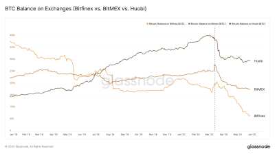 С марта было выведено как минимум 320 тысяч BTC. К такому выводу пришли эксперты аналитического портала Glassnode в своем последнем отчёте об исследовании рынка. С момента мартовского падения наибольший объём криптовалюты вывели с трех бирж: Huobi, BitMEX и Bitfinex. Торговые площадки потеряли 97 тысяч, 105 тысяч и 133 тысячи биткоинов клиентских средств соответственно. А это динамика изменения балансов бирж.