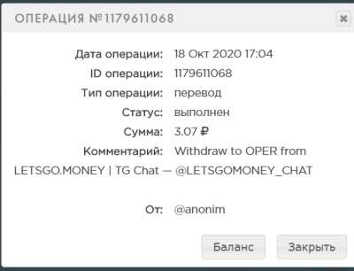 Я не админ и не владелец проекта. Вся информация взята с сайта проекта. Старт проекта 17.10.2020 Реферальная ссылка для регистрации https://letsgo.money/?r=3836 Подарок: Самолёт «Cessna 172» Об игре: Игра Без Баллов С выводом реальных денег от 1-100 рублей! Letsgo money — уникальная в своем роде экономическая игра для развлечения и заработка разработанная опытной командой под управлением международной компании DriftGames Limited. Развивайте собственную транспортную империю и зарабатывайте реальные деньги. В Letsgo money представлены сразу три экономические модели, регистрация совершенно бесплатна, а сам проект не требует ни каких инвестиций для осуществления выплат своего заработка. В Letsgo money существует 6 способов заработка, большинство из них не требуют никаких инвестиций и денежных вливаний. Вот несколько из них: «Самолёты», «Корабли», «Поезда», «Сёрфинг сайтов», «Задания», «Партнерская программа». А так же дополнительные бонусы - бесплатная «Лотерея», «Ежедневный бонус». Полноценно с каждым из них рекомендуем ознакомиться после регистрации своего аккаунта. Виды заработка без вложений: Ежедневный бонус: до 1000 руб Задания: до 300 руб Сёрфинг: на вывод Лотерея: каждый час - для всех Маркетинг: Начисления: ежесекундно Распределение дохода: 100% на вывод Инвестиционные планы: от 10 до 180 дней Общая доходность самолётов: от 20 до 36 % за 30 дней Общая доходность кораблей: от 103% до 145% за рейс Отсутствие платежных баллов! Аэропорт — это начало вашего пути в проекте. Сразу после регистрации, для максимально быстрого знакомства с проектом Вы получаете свой первый самолёт — «Cessna 172». Каждый самолёт зарабатывает фиксированную сумму за каждый час работы. Всего для покупки в Аэропорте доступны 12 самолётов, у каждого разная цена, скорость и окупаемость. Вы можете купить любой самолёт неограниченное количество раз. Срок работы всех самолётов составляет 180 дней с момента покупки, по истечению этого срока самолёт перестает приносить прибыль и удаляется из Вашего аэропорта. Рейсы — это отличная возможность в короткие сроки получить максимум прибыли! Начав выполнение любого из рейсов Вы будете получать прибыль ежесекундно в течение всего срока выполнения, который составляет от 10 до 90 дней в зависимости от конкретного рейса. Всего для покупки доступны 9 различных рейсов, одновременно Вы можете выполнять каждый из них только один раз. Как только срок выполнения начатого Вами рейса подойдет к концу Вы сможете начать его выполнение повторно, тем самым получив еще больше прибыли. На прибыль от рейсов не влияет бонус от «Гонки лидеров». Вы не можете начать выполнение любого понравившегося Вам рейса, сначала необходимо начать выполнение предыдущего. Бонусы: При регистрации дается: Самолёт «Cessna 172» За каждого реферала - 7% от его пополнений баланса «для покупок» на счет для вывода с 1ого уровня За каждого реферала - 3% от его пополнений баланса «для покупок» на счет для вывода с 2ого уровня За каждого реферала - 5% от всех пополнений баланса «для рекламы» на счет для вывода рефералом 1 уровня За каждого реферала - 20% от заработка реферала в разделе «Сёрфинг сайтов» Платежные системы проекта: Пополнить можно через: Пополнение в Letsgo реализовано через платежные системы Payeer, PerfectMoney, QIWI, Yandex.Money, Bitcoin, Ethereum, Free-Kassa, Наличные и другие. Пополнить свой баланс в проекте Letsgo можно через валюты: RUB, USD, EUR и криптовалюты. 