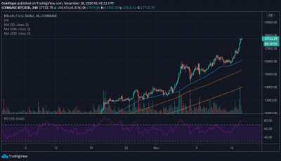 Биткоин ориентирован на восхождение к историческим максимумам, желательно до конца года. В пользу такого сценария говорят следующие факты: Биткойн преодолевает два различных препятствия менее чем за 48 часов, чтобы торговать на уровнях, невиданных с начала 2018 года. Быки игнорируют условия перекупленности и неустанно идет за прорыв выше 18 000 долларов. Взятие ключевого уровня 17000$ дает быкам полный контроль над ценой. Сейчас BTC достиг нового годового максимума в 17 879 долларов. Индекс относительной силы (RSI) уже указывает на условия перекупленности, предполагая, что в ближайшем будущем вероятен разворот. BTC / USD 4-часовой график С другой стороны, более высокая поддержка, возможно, выше 17 500 долларов, гарантирует, что Биткойн твердо удержит прибыль, накопленную с понедельника. Стоит отметить, что с поддержки 18000 долларов инвесторы могут быть уверены, что биткоин достигнет новых годовых максимумов до конца года. Несмотря на условия перекупленности и очевидные признаки разворота, BTC/USD пока находится в руках быков. Бычьи перспективы подкрепляются восходящим трендом цены биткойна выше 50 простых скользящих средних, 100 SMA и 200 SMA. Пока остается путь с наименьшим сопротивлением вверх. В случае коррекции, ключевые уровни поддержки 16 100, 15 400 и 14 000 долларов. Спотовая ставка: $ 17 727 Относительное изменение: 54