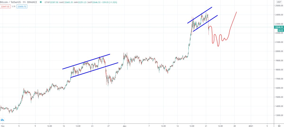 Сразу после установления нового исторического максимума на отметках выше $24 000 биткоин начал стремительно падать и на момент написания обзора торгуется у отметки $23 000. Подобную ситуацию можно было наблюдать ранее — обновление исторического максимума сменяется существенным снижением цены, которое ускоряется за счет ликвидаций позиций многочисленных покупателей. Несмотря на то, что отметку в $25 000 достичь не удалось, свою главную цель крупный капитал смог выполнить — выбить изначальные шорт-позиции походом выше $24 000. Похожая ситуация была около месяца назад — 25 ноября цена, двигаясь в восходящем канале и сформировав новый максимум, начала движение вниз. Цене удалось пробить нижнюю границу канала и продемонстрировать три волны нисходящего движения. По аналогии можно предположить, что цена биткоина реализует сценарий, указанный на графике внизу: небольшой рост чуть выше $23 000; снижение к $20 500-$21 500; продолжение глобального нисходящего тренда. На небольшом таймфрейме для первой цели краткосрочного роста можно отметить котировку $23 228, а в качестве цели дальнейшего снижения — $20 854. Важными рубежами для фиксации позиций выступают уровни, которые останавливали текущее снижение — $21 800 и $22 420. Стоит отметить и сильную реакцию рынка альткоинов — значительное снижение по ряду монет говорит о панических настроениях в условиях частичной неопределенности. Эта неделя вполне может стать «красной» для биткоина. Этому способствуют как внешние факторы, так и технические паттерны. И если говорить об открытии шорт-позиций пока еще рано, то момент для фиксации лонг-позиций (по крайней мере, частичной) может быть вполне подходящим.