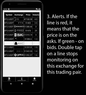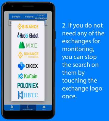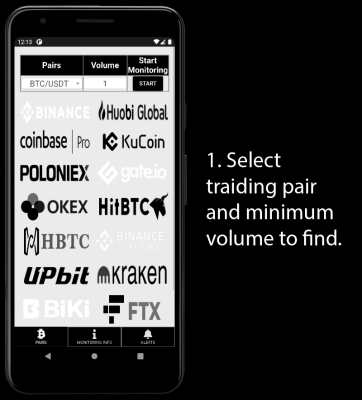 CryptoVolumeFinder - приложение для смартфонов на ОС Android. Поиск по умолчанию производится сразу на всех биржах из списка, на которых торгуется выбранная вами пара. По нахождению объема вы услышите алерт и на экран будет выведена уточняющая информация: цена, сам объем и биржа.