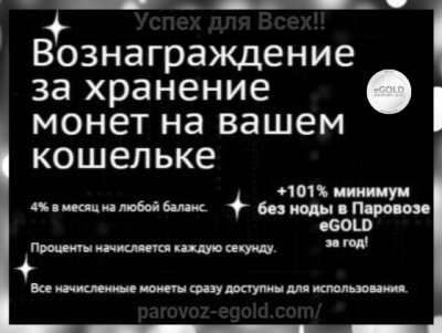 СОЗДАНИЕ монет eGOLD реализовано технологией стекинга с вознаграждением от 4 до 5% в месяц от общего количества монет, позволяющая зарабатывать монеты за свои материальные вложения, непосредственно со своего баланса кошелька. Начисления идут ежесекундно в автоматическом режиме на баланс, без необходимости включать для этого кошелёк или ноду. Это сделано для справедливого распределения монет между всеми участниками системы. А первоначальный выпуск сделан только для старта распространения монет. При этом, в соответствии с алгоритмом работы криптовалюты, разработчик не может добавить монеты в систему извне. Каждый держатель ноды является гарантом соблюдения правил заложенных в eGOLD. Анкета на сайте http://parovoz-egold.com/