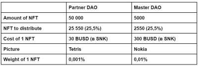 A total of 5000 NFT Master DAOs and 50,000 NFT Partner DAOs will be issued for a total of $3,000,000. If we compare DAO with shares of companies, then the total estimated value of the Cryptosnake project at the time of the start of sales is $3 million.