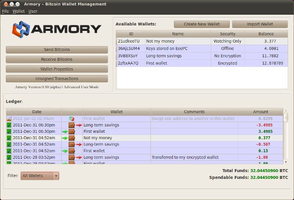 Armory прост в использовании даже для начинающих пользователей. Можно управлять несколькими кошельками, улучшена безопасность. С его помощью, для защиты от атак из интернета, можно хранить кошельки офлайн. Адреса, сгенерированные при помощи программы VanityGen, легко импортировать в кошелек.